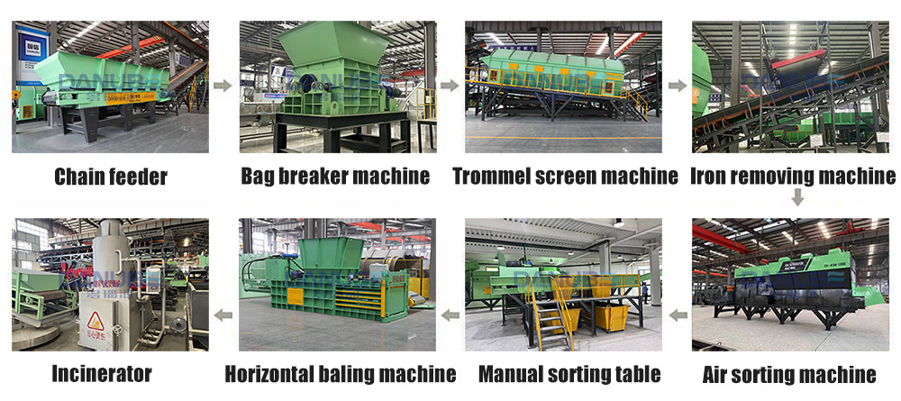 | 1,Box Feeding machine/Chain feeder 2,Bag breaker 3,Trommel screen 4,Air separation machine 5,2 sets manual sorting table(1 set for light materials,1 set for heavy materials) 6,Hydraulic baling machine 7,RDF machines line |